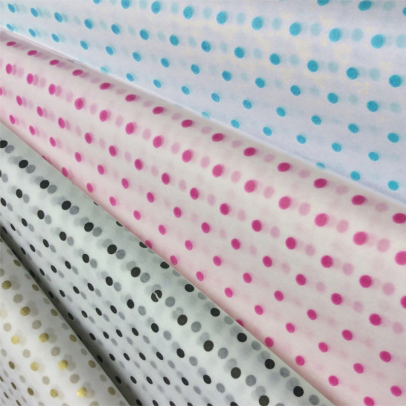 A selection of polka dot printed tissue paper. Colours include, Gold, Silver, White, Pink, Blue & Black
