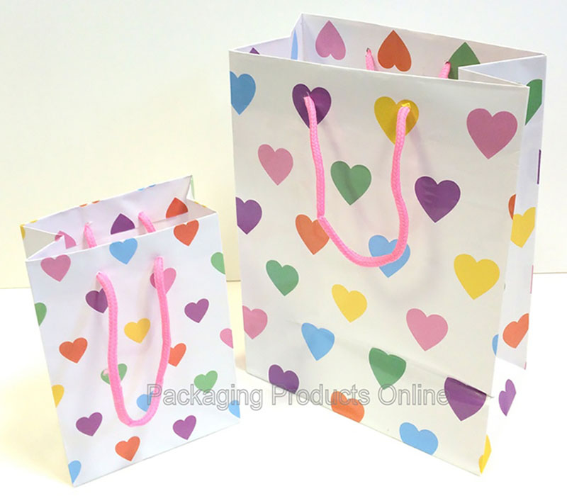 Pastel Hearts print gift bags, gift carrier bags with cord handles, available in Small (15 x 11.5 x 6 cm) and Medium (23 x 18 X 10cm) sizes. Perfect for gifts on any occasion. Paper grade 158gsm.
