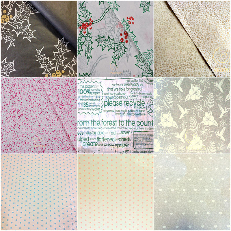 When it comes to gift packing and wrapping our tissue paper is the ideal product to use. Our tissue paper is acid free and machine glazed to a high quality finish, perfect for wrapping gifts, valuable and other items. The addition of a printed design adds even more to the luxurious feel of our tissue. Also excellent for Playgroups, Schools and Arts and Craft clubs, it is simple to use and available in a variety of designs, ideally suited to occasions such as Christmas and Valentine’s Day. It can also be used scrunched up as colourful void fill for gift and product boxes and bags. We regularly supply our tissue paper to local boutiques and florists looking for that ideal finishing touch. Our tissue paper is supplied in 480 sheets per ream, with a sheet size of 450mm x 750mm (17.75″ x 29.5″).